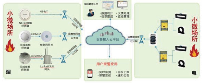 聯網場所發生火警或故障,通過溫度傳感器、剩余電流互感器等前端設備監測到的信息,通過傳輸裝置上傳至云服務中心,消防部門可通過監控中心以及手機終端獲取實時上傳的火警信息,及時確認火警真偽,并快速處理。
