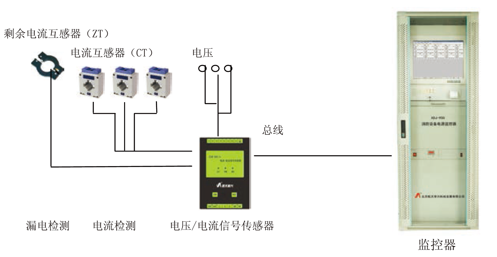 消防設備電源電壓/電流信號傳感器采用剩余電流互感器(ZT)監測配電線路的漏電電流,采用電流互感器(CT)監測線路中的過線負載電流,同時也監測電路的三項電壓值。傳感器檢測的信息經總線傳輸至監控器,監控器實時接收各傳感器發送的各種信息,并在監控器屏幕上實時顯示,監控器具有聲光報警、數字顯示、數據存儲、查詢、打印輸出、報警信號輸出等功能。